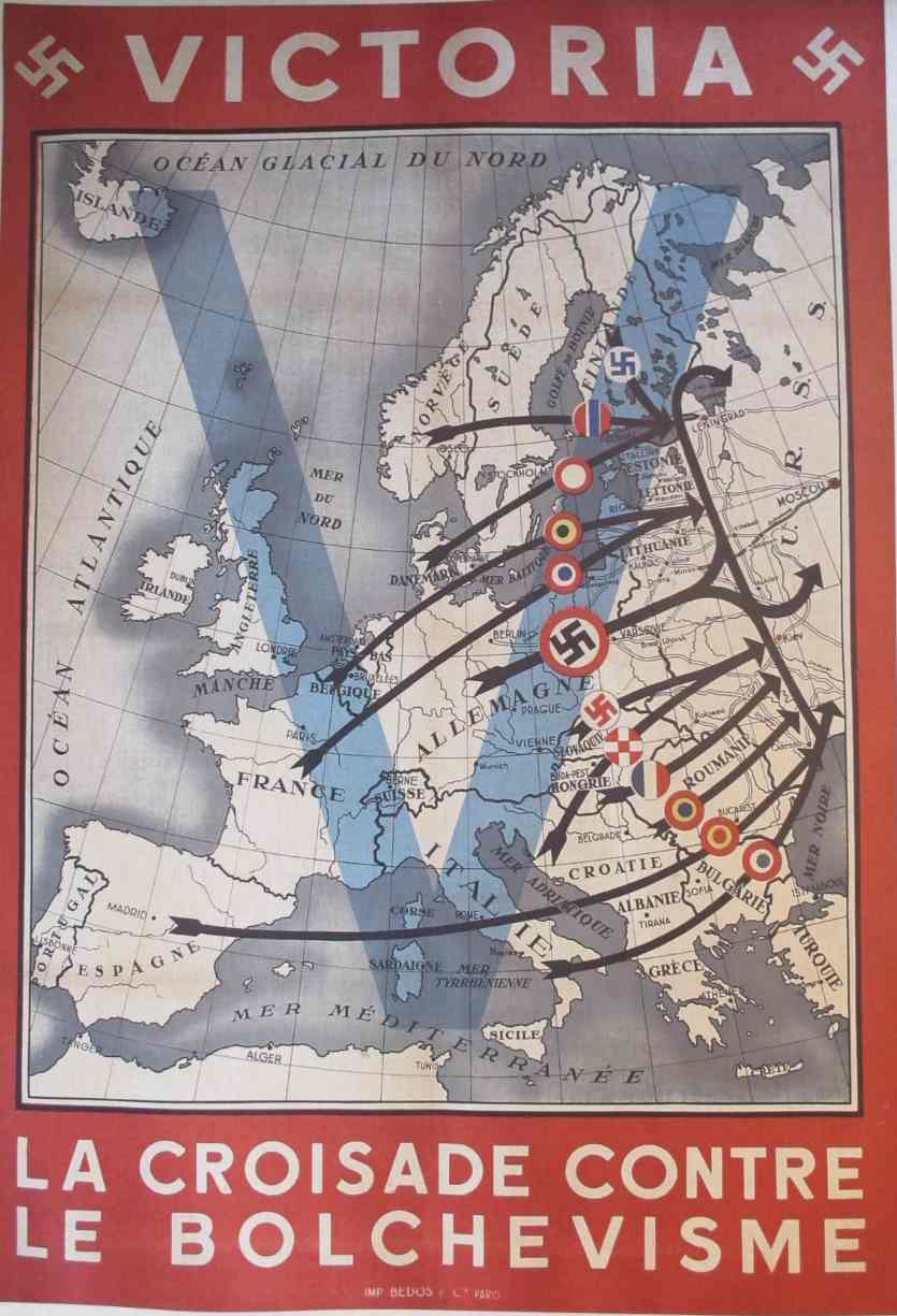 La pretendida “cruzada contra el bolchevismo” lo fue sobretodo contra los judios y las democracias, como muestra este cartel pro nazi francés