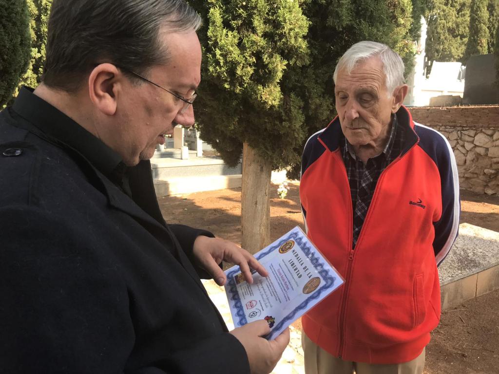 A continuación, el Foro por la Memoria de Guadalajara le entregó un diploma con una propuesta de “Medalla de la Libertad”, que reproduce una medalla republicana de 1937, y que ya habia sido entregado a su sobrina, Isabel Hernando, socia del propio Foro. Estos diplomas, de caracter simbólico, se une a los más de 60 que han recibido ya resistentes antifascistas y a victimas del franquismo y a sus familiares, militantes de diversas organizaciones de Guadalajara, como homenaje. Según indica el propios diplomas, se entregan “en ausencia del gobierno legítimo de la República”. Vladimiro recibió emocionado el diploma. Los asistentes continuaron la visita al camposanto acudiendo a los otros lugares de memoria, especialmente el patio 4º, donde otros 370 antifascistas fueron asesinados y donde varios familiares han colocado placas dedicadas a sus seres queridos asesinados, y las organizaciones políticas a las que pertenecían, en espera de que algún dia se ponga la placa colectiva e INSTITUCIONAL que se aprobó en pleno en junio de 2017.