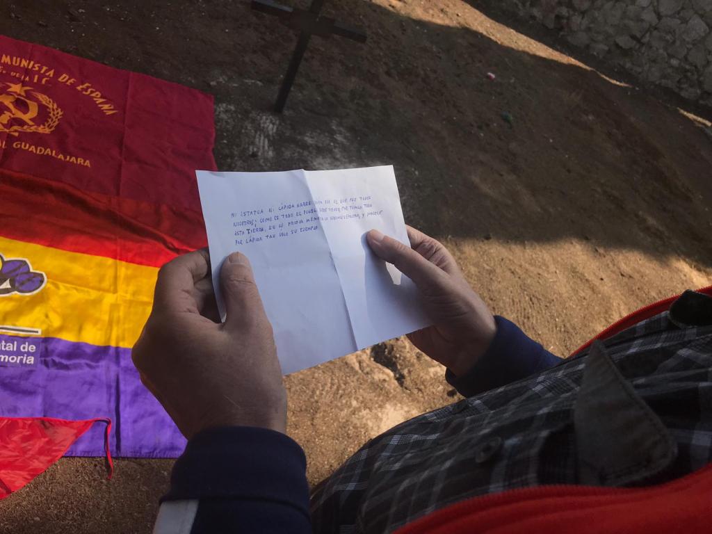Una jornada emocionante que remató con la petición de Vladimiro al ayuntamiento de nuestra ciudad, de colocación de una placa en el lugar donde reposan los restos de su padre, Situado a apenas 10 pasos del lugar donde hace dos años fueron exhumados 53 cuerpos, entre ellos, el de Timoteo Mendieta. En su petición, Vladi dejó claro que “no renuncio a la placa colectiva” que esperamos sea colocada pronto, con todos los nombres, Tambien que no autoriza a que los restos de su padre sean exhumados si no es por el juzgado y la policia judicial en el seno de una investigación penal,