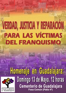 En este mayo de 2012, el Foro por la Memoria de Guadalajara invita a todos los miembros de la corporación municipal y otras autoridades de Guadalajara a participar en un acto en defensa de los valores democráticos y de homenaje a las víctimas. El acto tendrá lugar a las 12 h del próximo dia 13 de mayo, al pie de la fosa común del patio 4º.